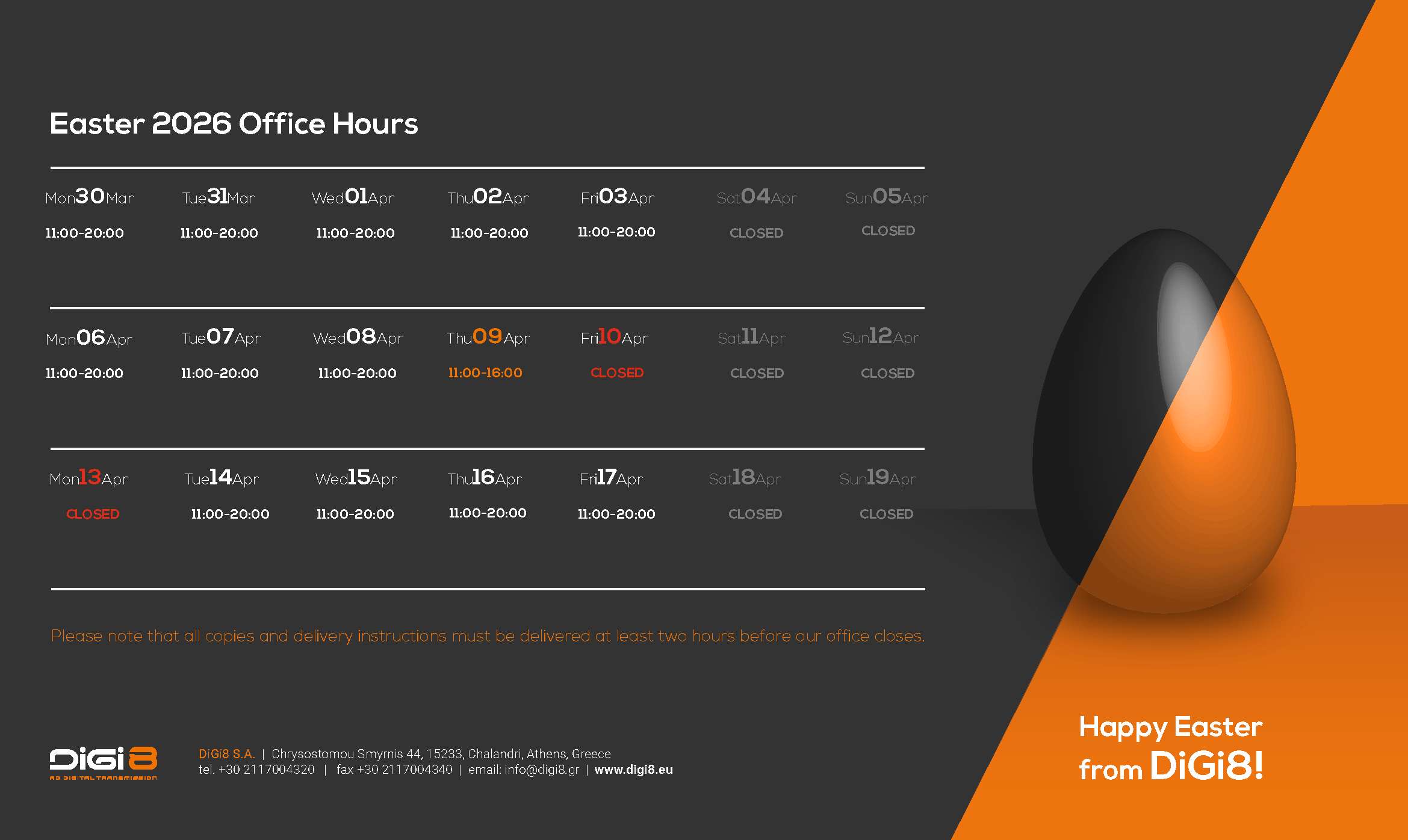 Please be informed that our office hours during Easter will be as follows: