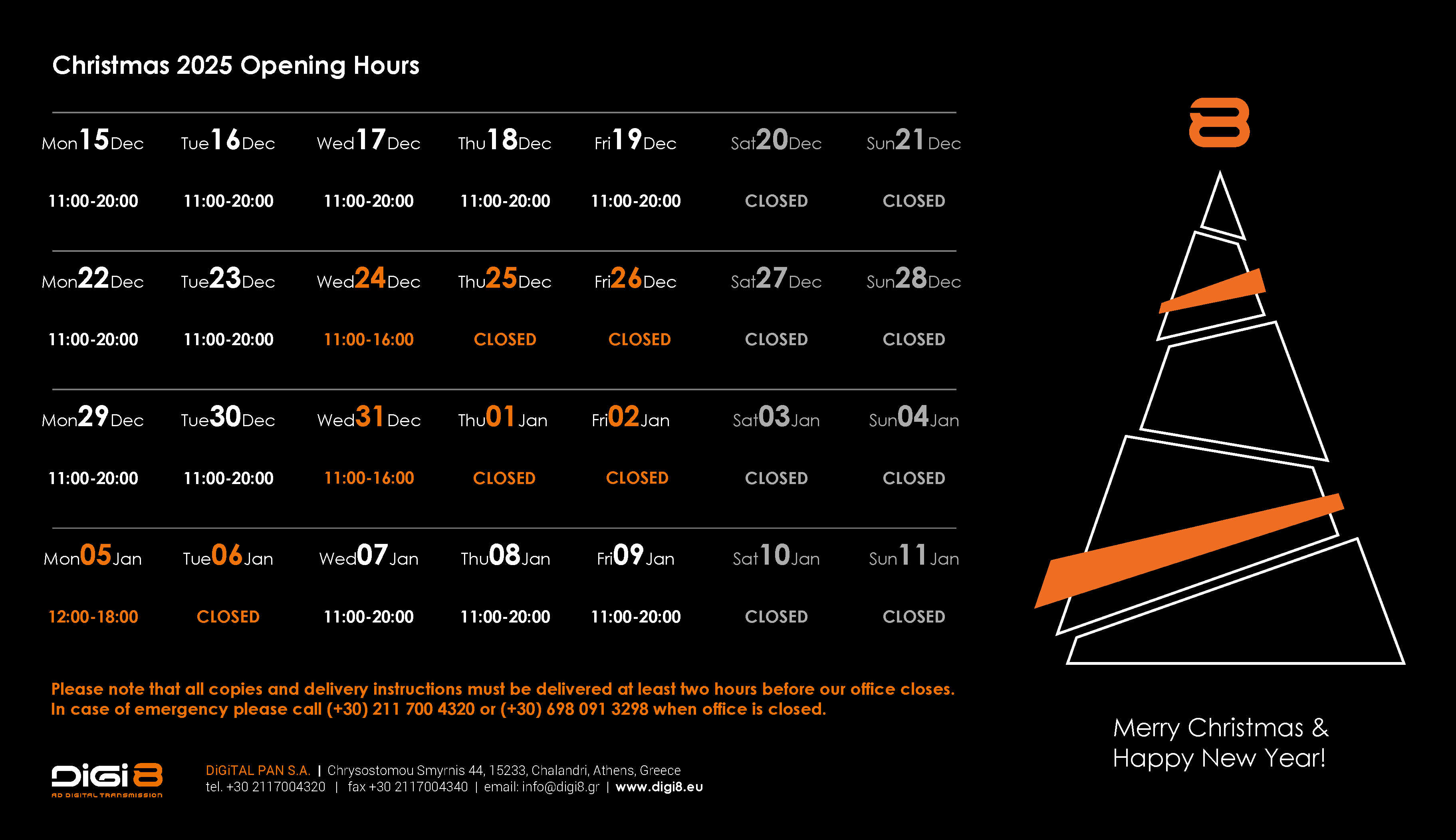 Please be informed that our office hours during Christmas and New Year Holiday will be as follows:
